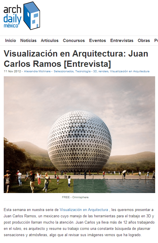 13/11/201222/03/2021 Archdaily Interview http://www.archdaily.mx/170291/visualizacion-en-arquitectura-juan-carlos-ramos-entrevista/ Share this: Click to share on Facebook (Opens in new window) Facebook Click to share on X (Opens in new window) X Click to share on Pinterest (Opens in new window) Pinterest Click to share on Tumblr (Opens in new window) Tumblr Click to share on LinkedIn (Opens in new window) LinkedIn Like Loading... Relacionado