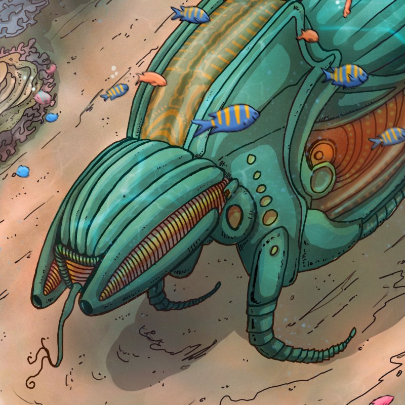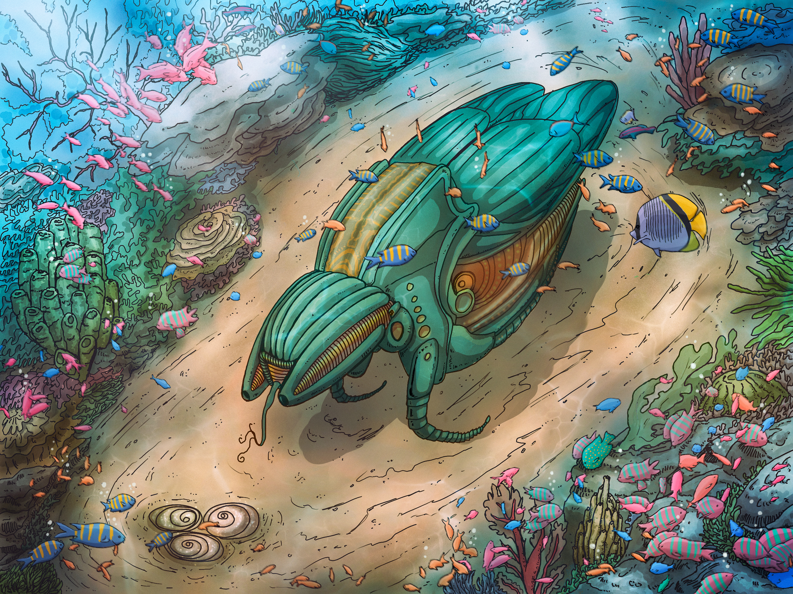 This week I want to share this illustration about this mysterious artificial intelligence lurking in a coral reef. In this case, I decided to work strictly on the digital realm, It’s so important for me to challenge myself on every personal project, this way I can experiment with new software, take my time to improve/develop a new skill, or do something just because I love the subject.