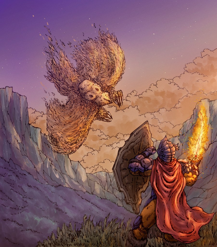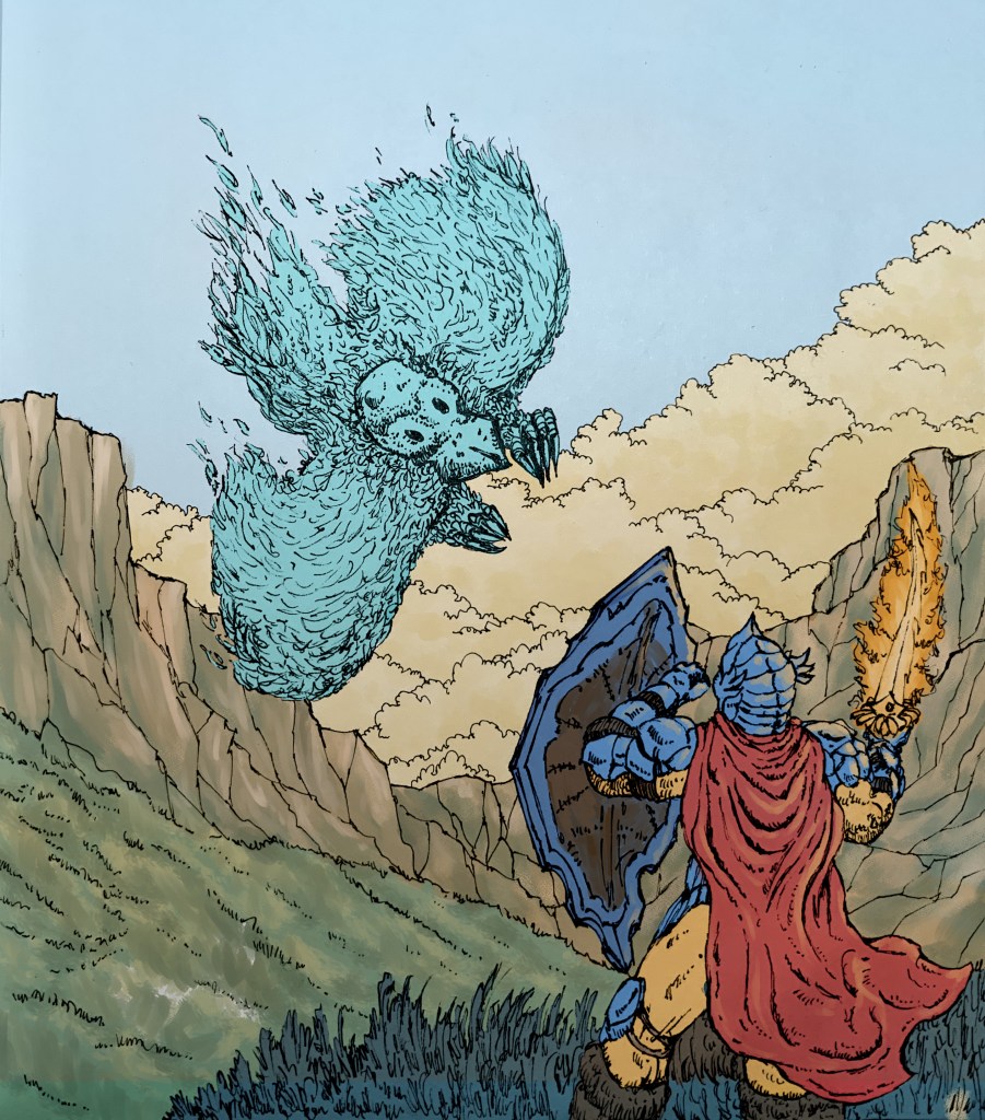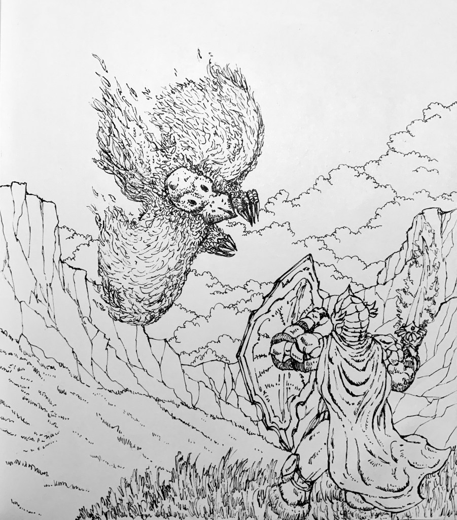 The Knight design was inspired by the Dragon Quest franchise, and the monster is more like a wizard transformed into a bird, like one from the main characters in Howl’s Moving Castle from Studio Ghibli. About the technique, I started with a quick pencil draft in my sketchbook and later applied ink.